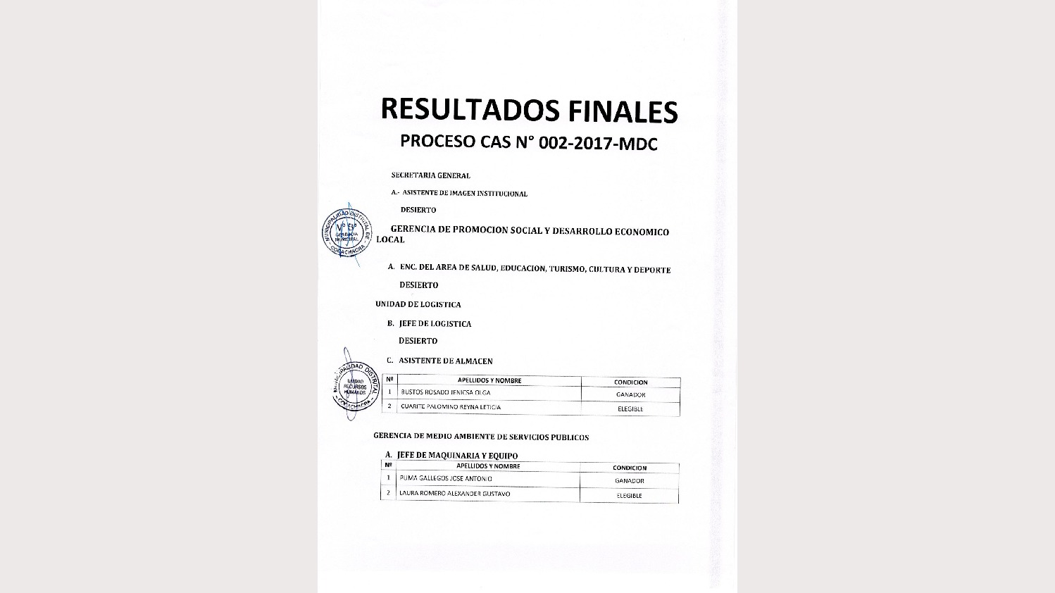 Resultado final CAS N°002 - 2017-MDC