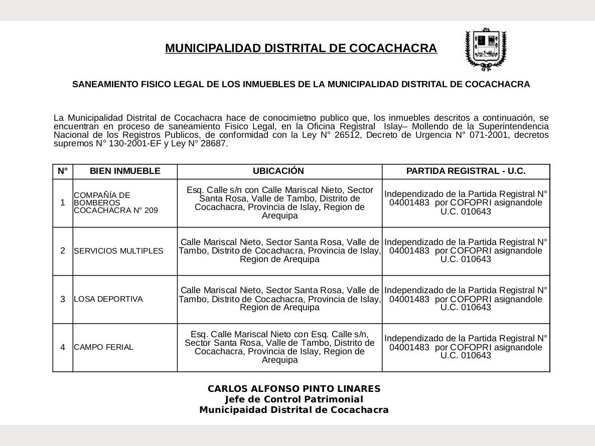 Sanemiento Fisico Legal de los inmuebles de la Municipalidad Distrital Cocachacra