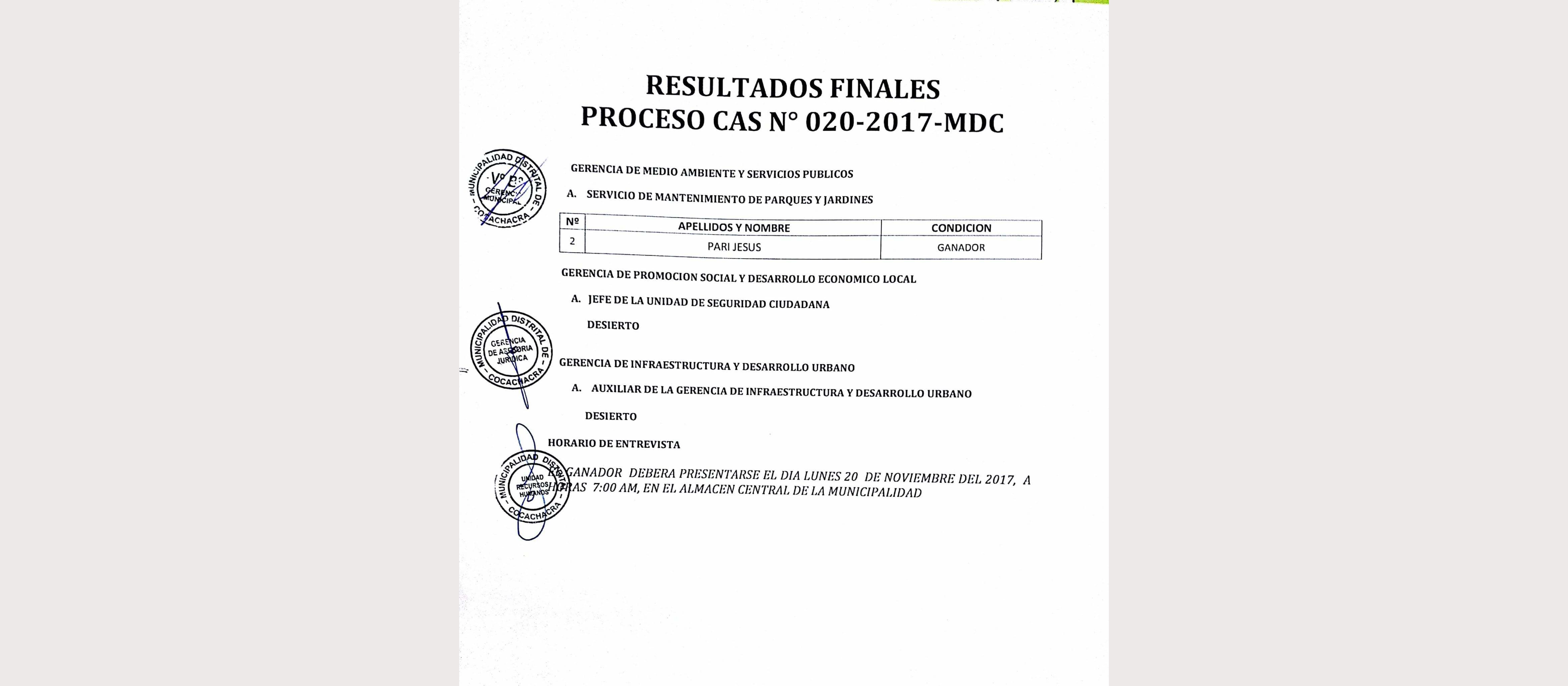 Resultado Final Proceso CAS N° 020-2017-MDC