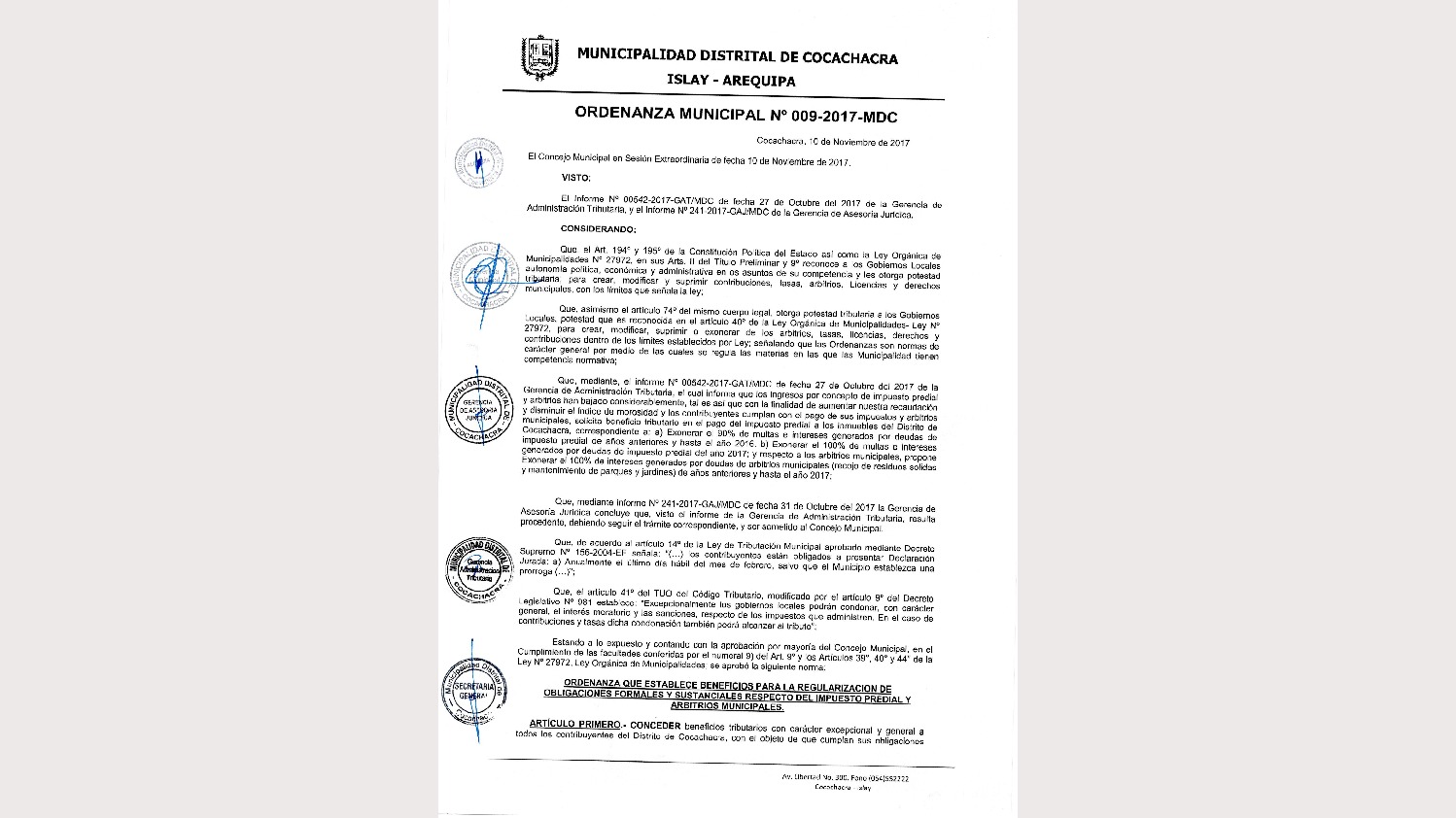 Ordenanza Municipal N° 009-2017-MDC Beneficio Tributario