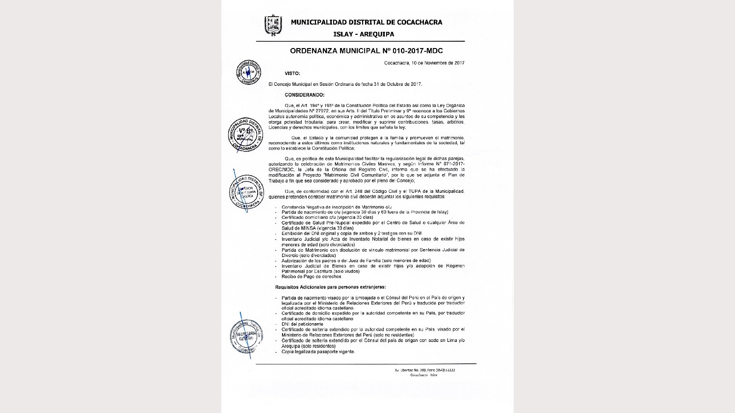 Ordenanza Municipal 010-2017-MDC que establece los Requisitos para el Matrimonio Civil Comunitario que se realizara el dia 16 de