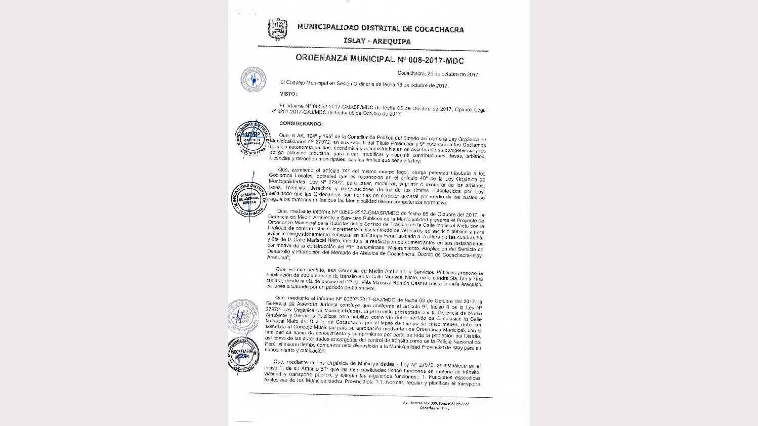 Ordenanza Municipal N° 008-2017-MDC Habilitacion de doble Sentido cuadras 5,6,7 desde la via de acceso PPJJ Villa Ramon Castill
