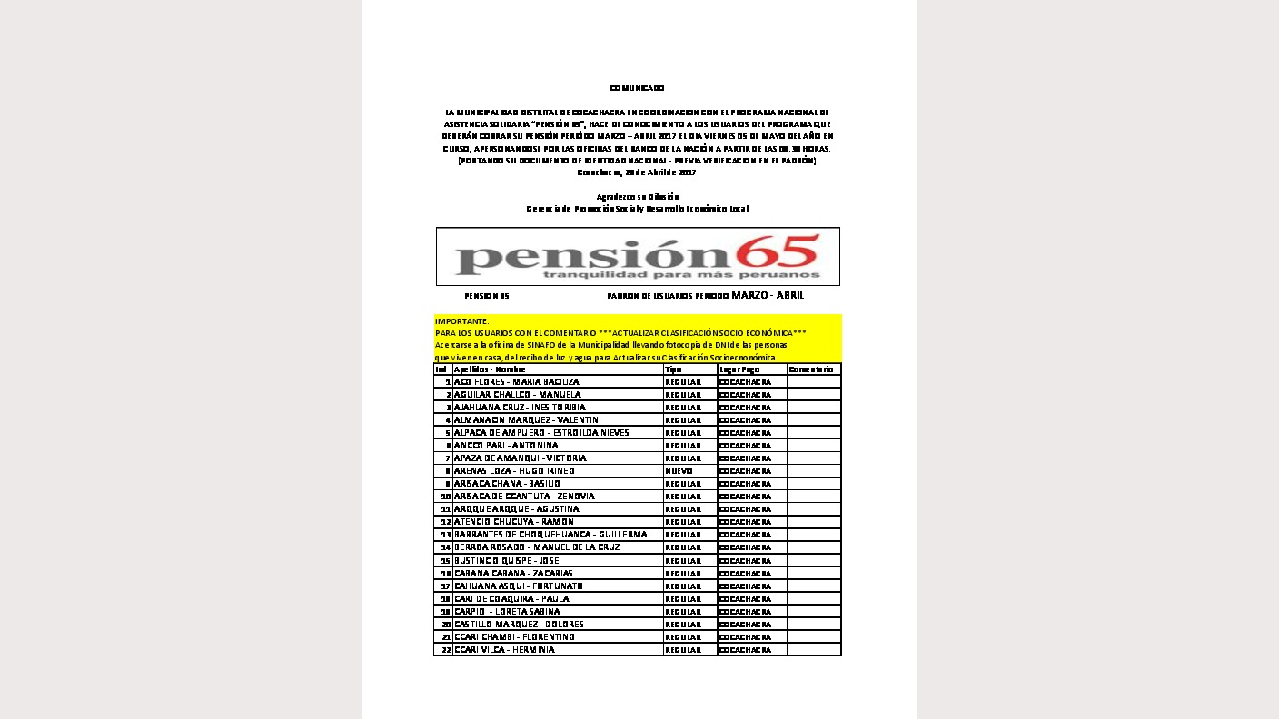 Comunicado Pension 65 Padron de Usuarios periodo Marzo Abril