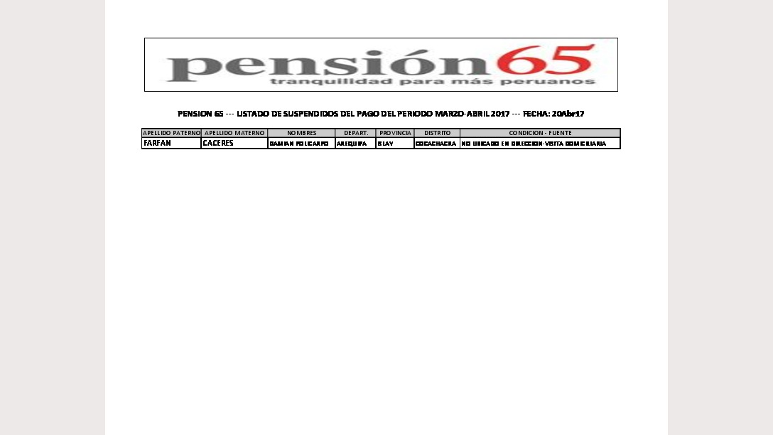 PENSION 65 - LISTADO DE SUSPENDIDOS DEL PAGO DEL PERIODO MARZO-ABRIL 2017 - FECHA: 20Abr17